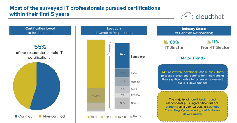 The survey also indicates a demographic shift-20% of certified professionals are now based in Tier II cities, underscoring their growing importance in India’s IT ecosystem. Furthermore, students and career-switchers from non-IT backgrounds in these regions are increasingly pursuing certifications in Microsoft Azure, AWS, and Data Science, preparing themselves for consulting, software development, and cybersecurity roles.